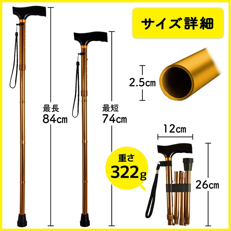 - 【5段階で高さ調節可能】ボタンを押すだけで、長さは74cm~84cmに調整することが可能で、身長142cm位の方から162cm位の方までご使用でき小柄な方でも安心してお使いできます。