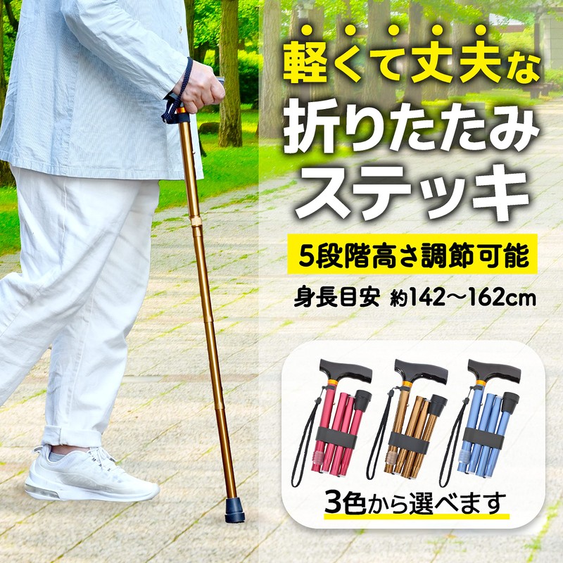 杖 女性用 軽量 つえ 介護 ステッキ 折りたたみ杖 茶色【高さ 74〜84cm 身長145cm~165cm向け】【折りたたみ可能で軽量 長さ調節可能 収納袋付き】歩行器 介護杖 女性 男性 京都 宇治 ヤマサン