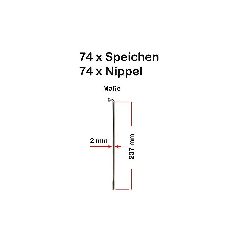 - 74 high-quality and reliable galvanised spokes diameter: 2.0 mm robust and lightweight spoke length: 237 mm colour: silver material of spokes: galvanised silver