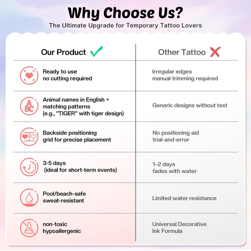 - 【Easy Application Guide】No more upside-down tattoos! Each 1.7" tattoo features animal silhouette guides on the backing for perfect positioning. Follow the 3-step instructions on every sleeve: peel, Press, show