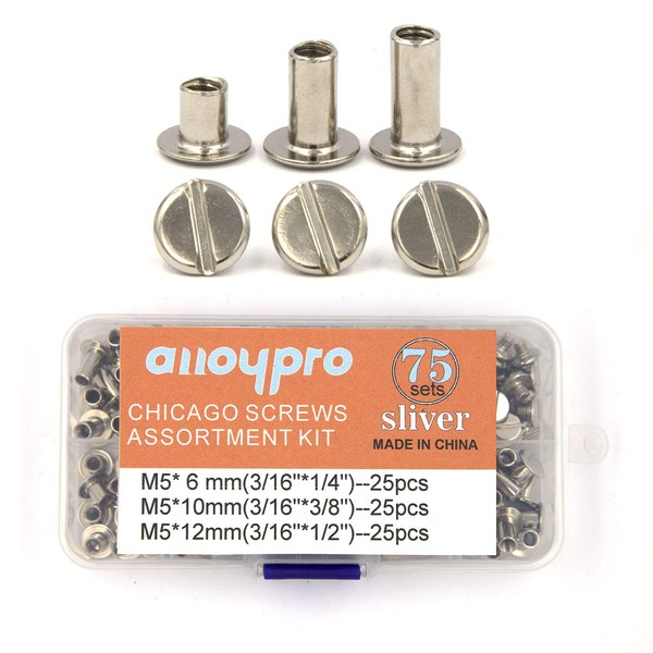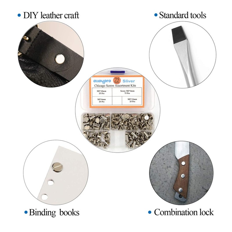 - 75 sets of 3 sizes:The chicago rivets set kit include 3 sizes, 25 sets for each size, the diameter of these screw rivtes are all 5mm(3/16 inch). 3 kind of post length are 6mm(1/4 inch), 10mm(3/8 inch),12mm(1/2 inch).Various lengths are available to meet your different needs.