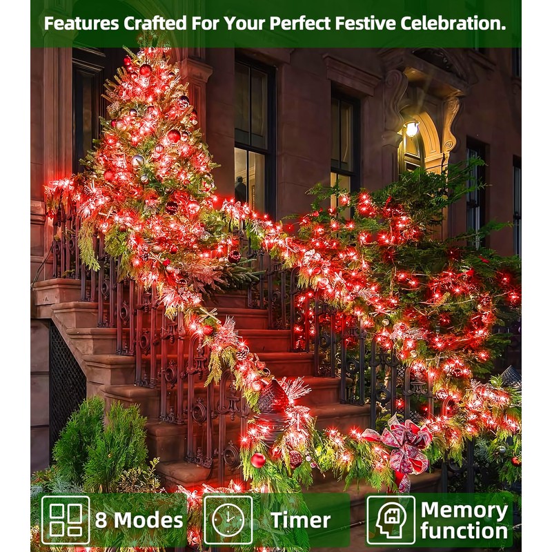 - 12 Multi-Function Modes with Memory Timer: Choose from 12 dynamic lighting effects—including twinkle, flash, and fade—to to set the mood for different occasions. The auto timer (6H ON / 18H OFF) with memory function provide your lights turns on and off automatically every day. Easily create a bright and colorful display with customizable options