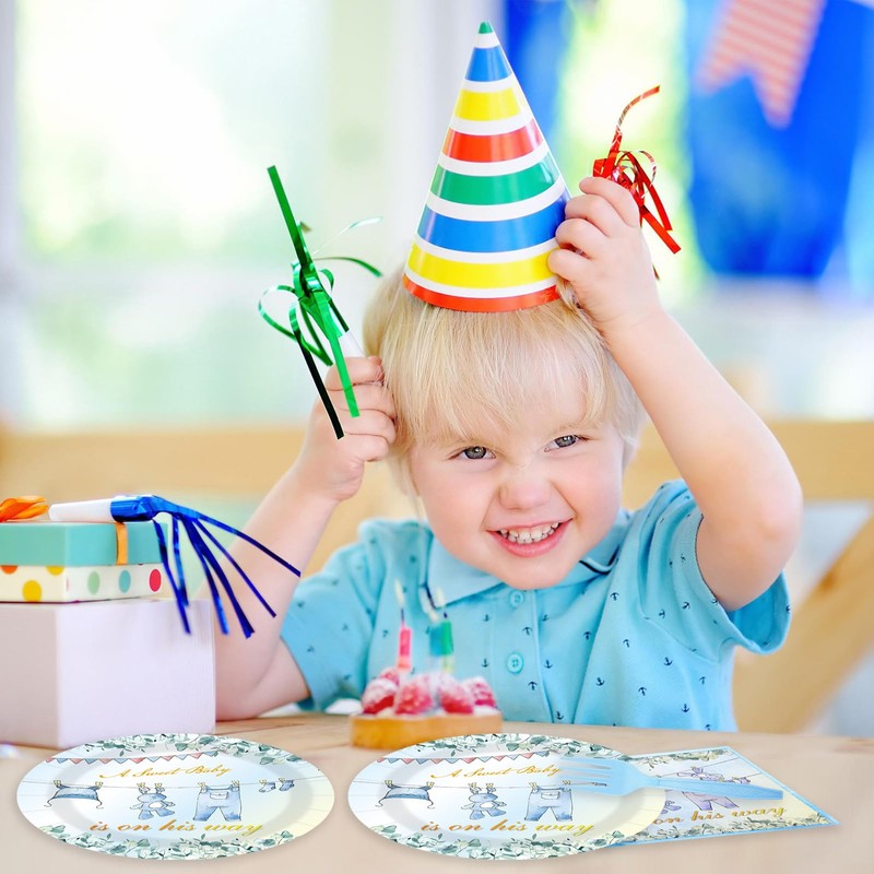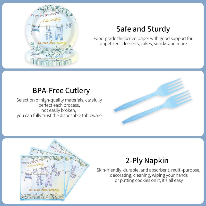 - 【UNIQUE DESIGN】Designed specifically for your baby boy, baby shower plates and napkins are spirited and adorable, making them the ideal tableware for welcoming your little boy party! Greenery paper plates with cute baby clothes design, these baby shower decorations for boy create a beautiful and festive atmosphere.