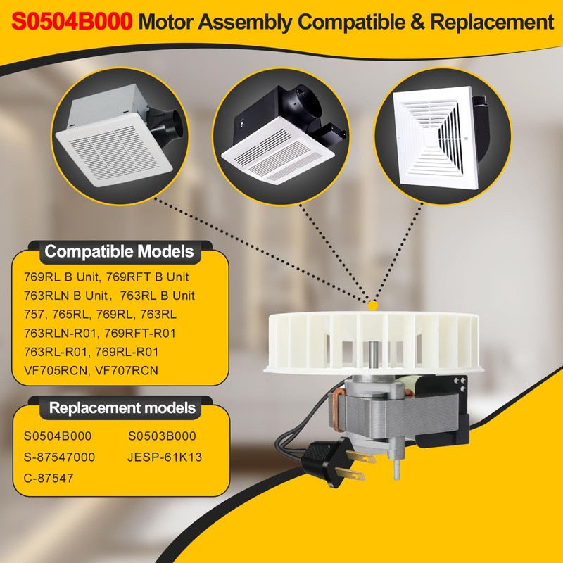 - Motor Assembly Replace part: S0504B000, Replaces motor: S-87547000/JESP-61K13/C-87547. Perfect replacement for 769RL B Unit, 769RFT B Unit, 763RLN B Unit,763RL B Unit, 757, 763RLN-R01, 769RFT-R01, 769RL, 769RL B Unit, 763RL, 763RL-R01, 769RL-R01, VF705RCN, VF707RCN, 765RL replacement motor series fan. Also serves as an upgraded replacement for the 50 CFM model S0503B000.