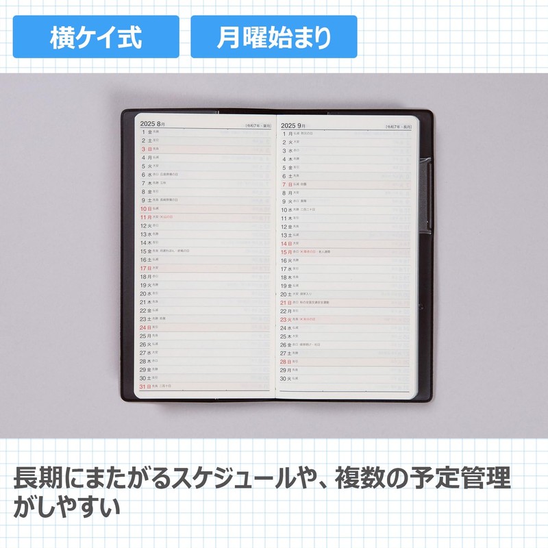 • Monthly Planning Column: Horizontal type 1 page for 1 month. It is easy to write on long term planners such as business trips.