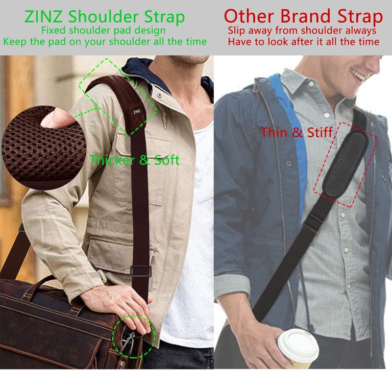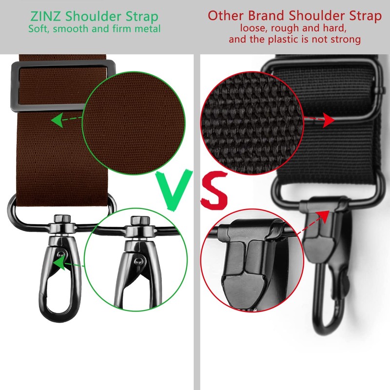 - 1. ABOUT ZINZ BAG SHOULDER STRAP: ZINZ universal bag strap replacement can replace all broken straps of ANY BAG WITH D-RINGS OR EQUIVALENT HARDWARE. Especially for shoulder bag / laptop computer bag / briefcase / messenger bag / duffel bag / diaper bag / tool bag / guitar bag. Professional package, 24hrs after-sale service, 30-DAY MONEY-BACK for ZINZ Shoulder Strap.
