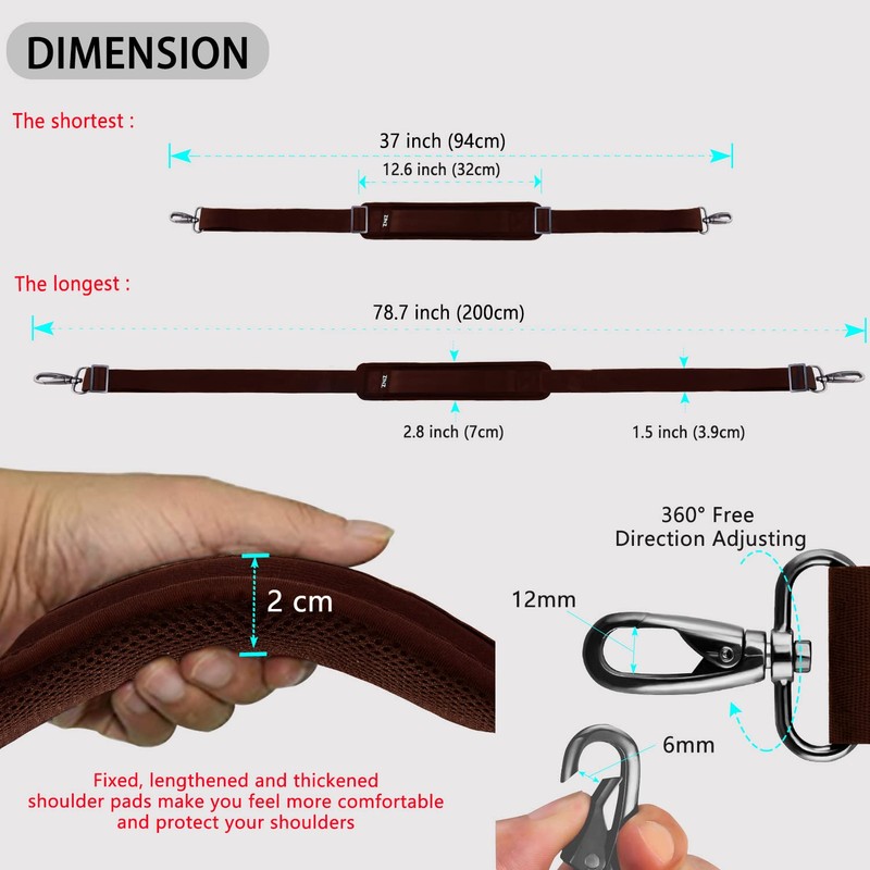 79 inch Shoulder Strap, Extra-Thick Fixed Cushion Pad and Dual Clasps Universal Replacement Strap with Metal Swivel Hooks for Laptop Bags, Luggage Bags, Camera, Crossbody (200cm,Brown)