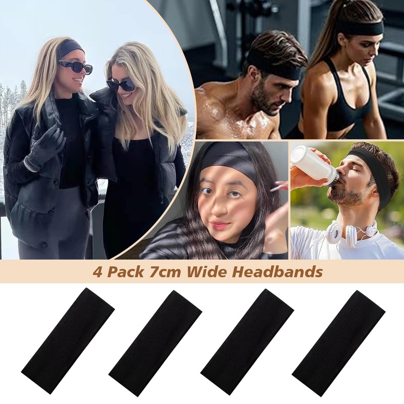 7cm Wide Headbands, Plain Stretchy Hairbands for Women & Men, Headband Bandeau for Gym, Exercise, Yoga, Running, Workouts, Soft Breathable Sweat-Wicking Sports Headbands for Daily Use (LPK, 4 Pack)