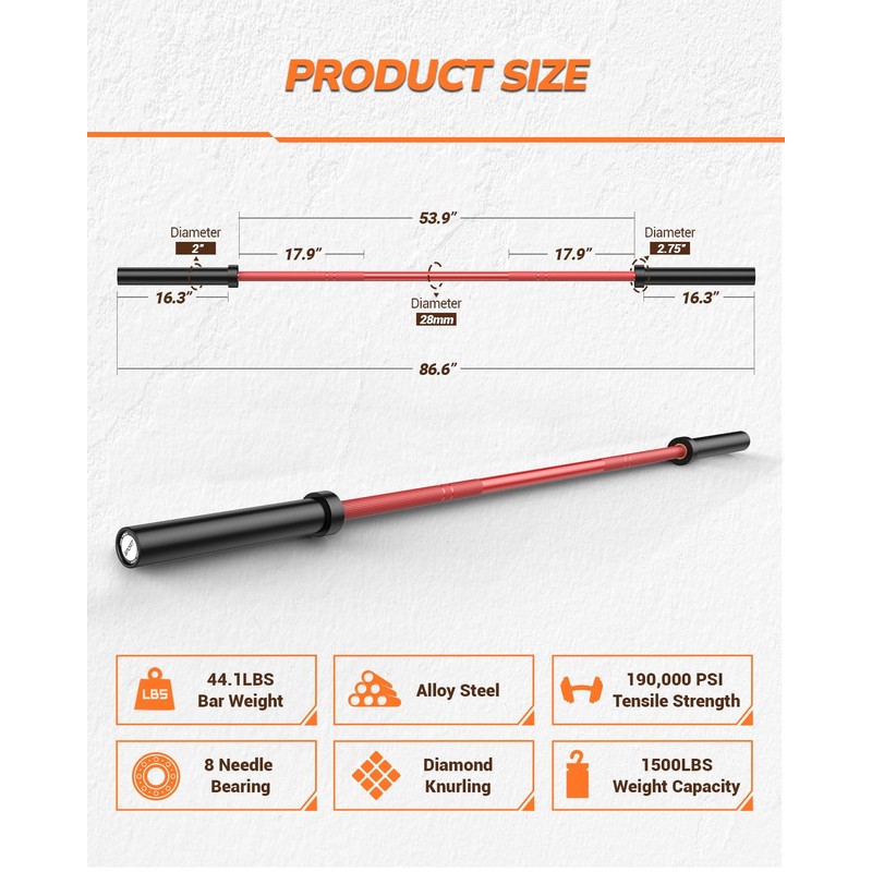 - 【Compact Design & Low-Friction Efficiency for Home Gyms】With a space-saving 7-foot profile and low-friction bearings, this barbell delivers gym-quality performance in compact spaces. The streamlined design fits seamlessly into home setups, while the hard chrome sleeves ensure quick, quiet plate changes. Perfect for squats, overhead presses, it maximizes efficiency without sacrificing stability.