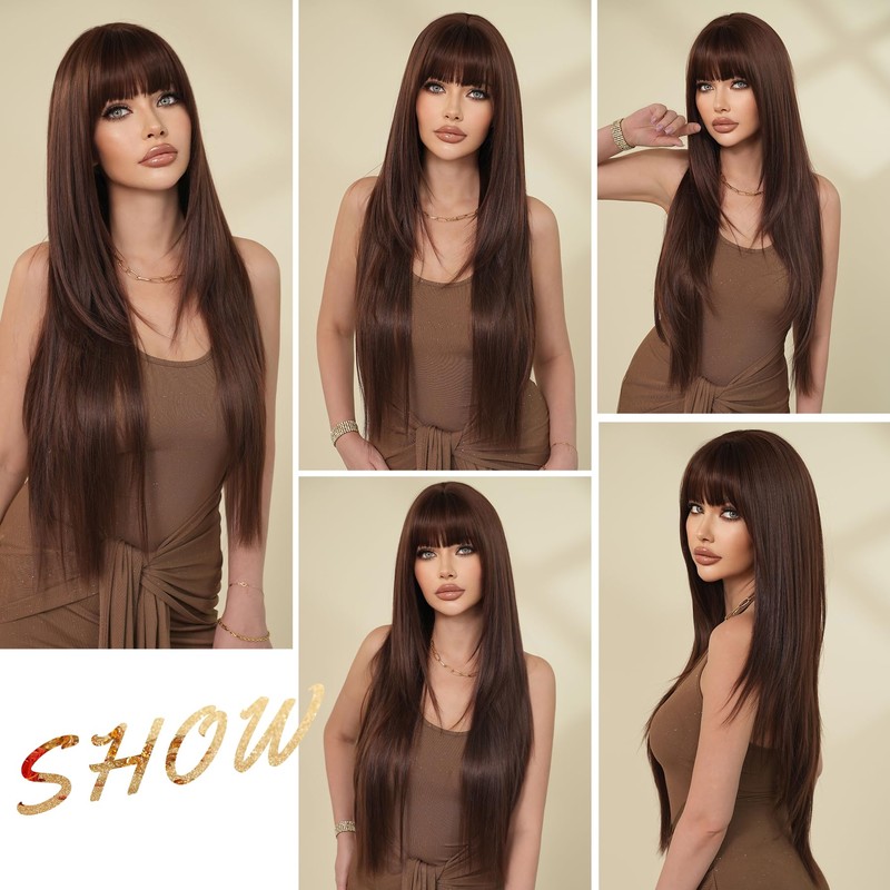 - ★【Ultra-realistic Wigs】The fashion natural dark brown wig adopts the front bangs design, which perfectly covers the hairline, helps you create a truly natural makeup, perfectly fits the skin, and makes the long layered cut synthetic straight wig look more natural and lifelike.The long wig with bangs design makes this wig a popular look.
