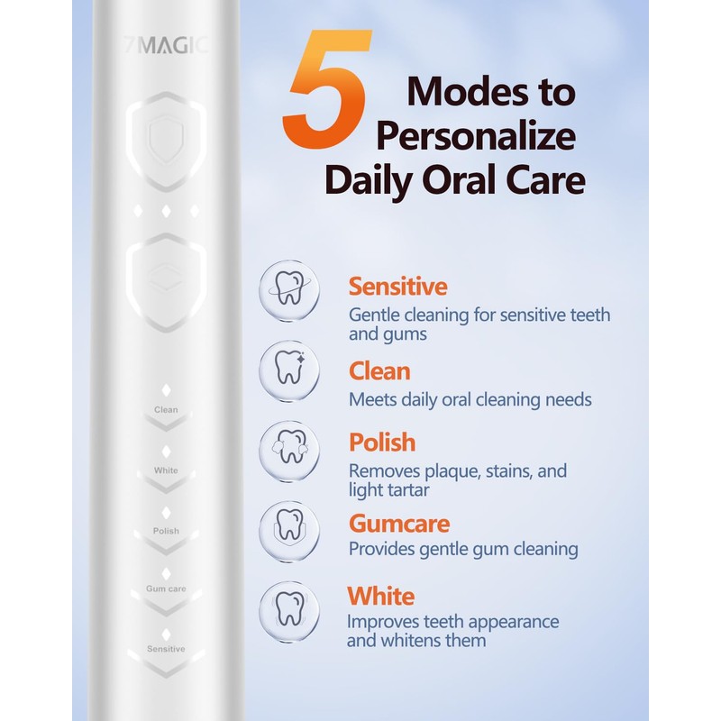 7MAGIC Electric Toothbrush, Fast Charging Last 60 Days, Sonic Toothbrush with 3 Intensity Levels & 5 Modes, 2-Min Smart Timer, White