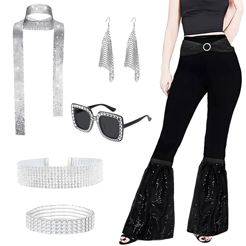 - 【Premium Materials】: We have crafted this disco fancy dress Kit set using high-quality materials. The black leggings are made of soft, comfortable, and breathable polyester, ensuring you remain cozy even after prolonged wear. The other accessories are constructed from sturdy rhinestones and plastic, designed for reuse, allowing you to embrace the disco vibe anytime, anywhere