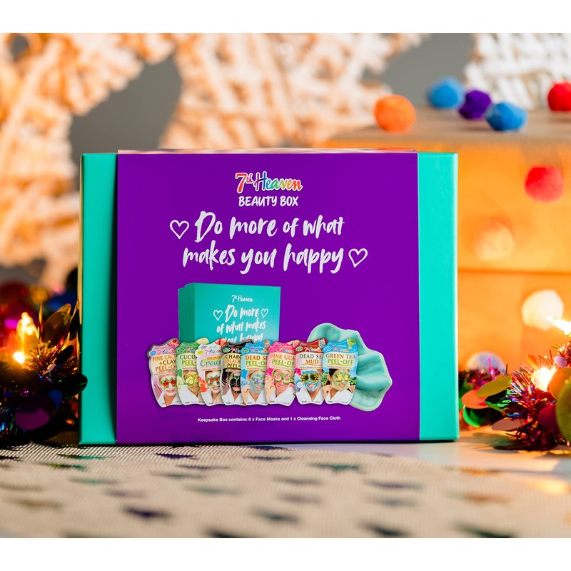 7th Heaven Face Mask Beauty Box Skincare Set - 8 x Face Masks & Soft Cleansing Face Cloth - 6 Variety Peel Off Face Masks, Dead Sea Mud Mask & Strawberry Cream Hydrating Mask - Gift Set with Box