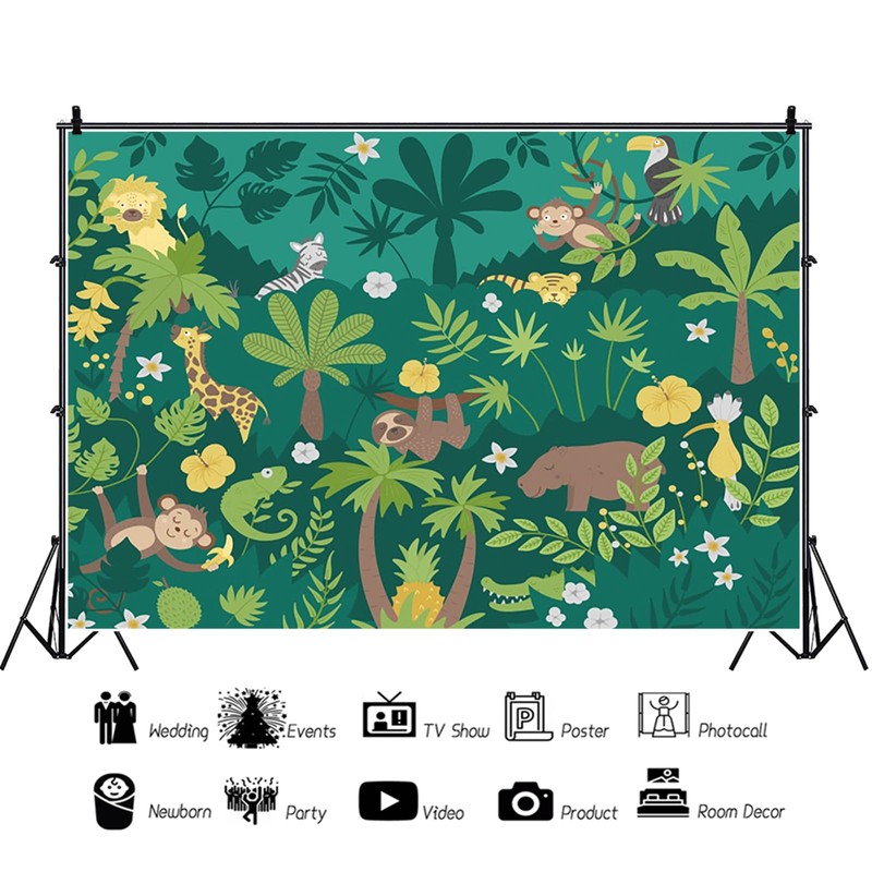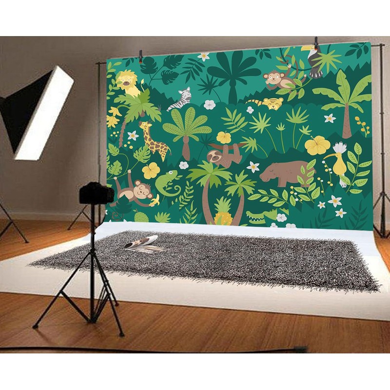 7x5ft Jungle Forest Backdrop Cartoon Animals Monkey Giraffe Palm Tree Green Background Birthday Baby Shower Party Supplies Wall Hanging Decor Kids Children Portrait Photo Studio Props