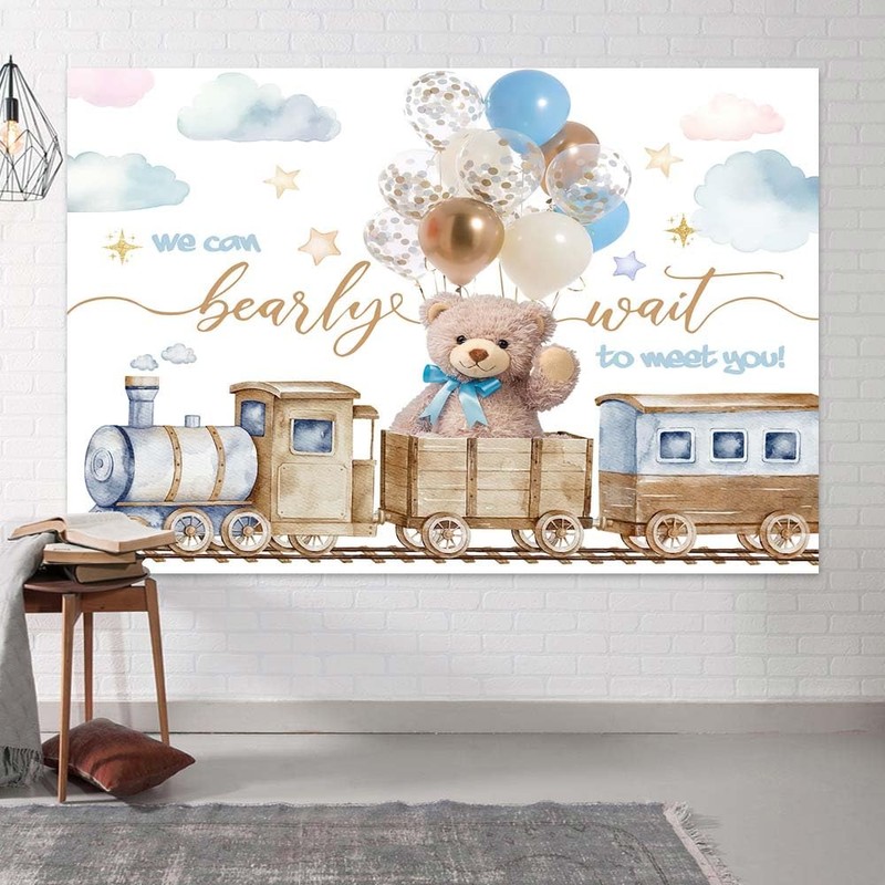 7X5ft We Can Bearly Wait Photo Backdrop Bear Baby Shower Photography Background for Boys, Cute Retro Wooden Train Balloons Newborn Backdrops Photo Booth Prop Decorations Wall Decor Tablecloth