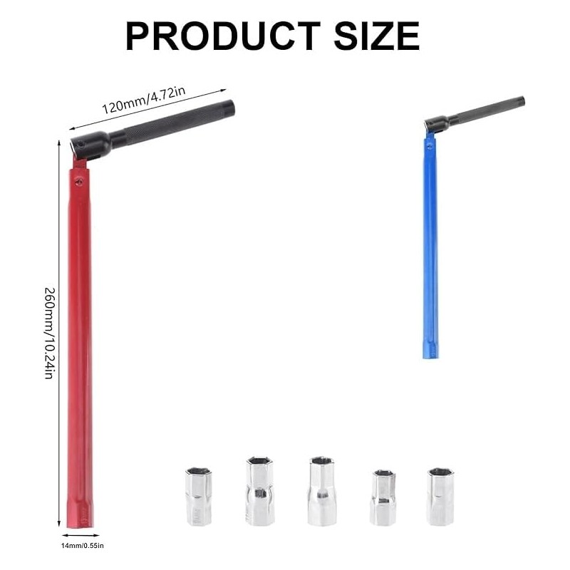 The socket wrench disassembly tool has 8 mm, 9 mm, 10 mm, 11 mm, and 12 mm heads and 13 mm hex at the end of the rod to meet different needs