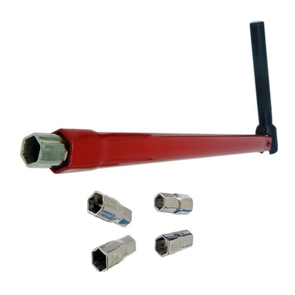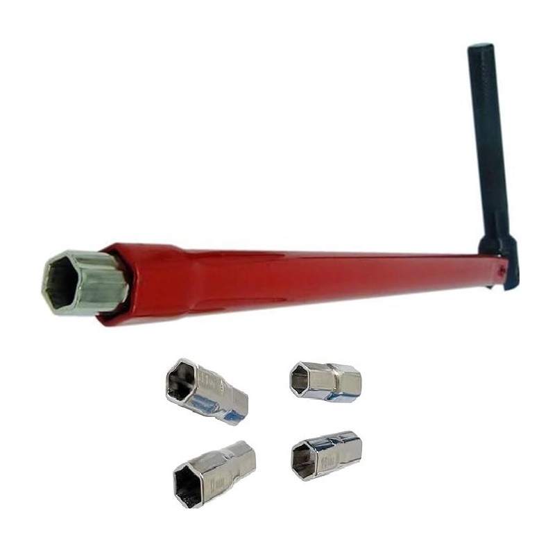 The socket wrench disassembly tool has 8 mm, 9 mm, 10 mm, 11 mm, and 12 mm heads and 13 mm hex at the end of the rod to meet different needs