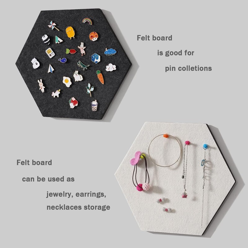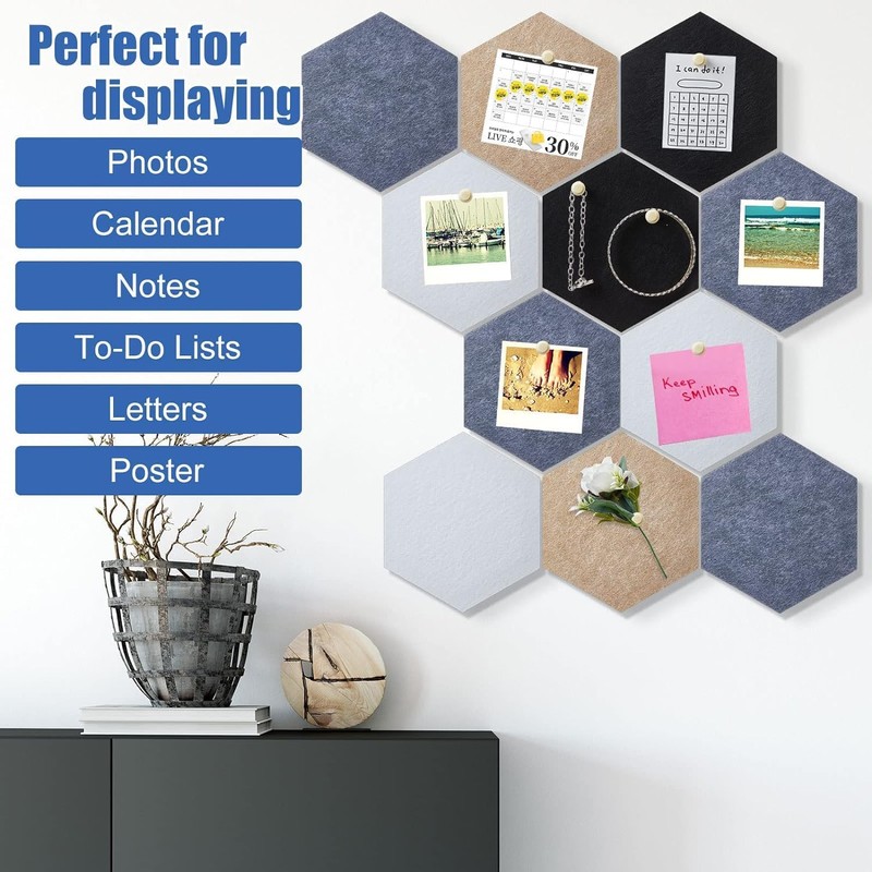 - Amplia aplicación: Estos tableros de anuncios de fieltro se pueden utilizar ampliamente en oficinas, hogares y aulas, para decorar aulas, envoltorios, tarjetas de adorno, carteles, álbumes de recortes, marcos de fotos, diarios, etc, azulejos de tablero hexagonal, tablero de corcho hexagonal. Puedes mostrar tus fotos favoritas, tarjetas de vacaciones y notas de recordatorio.