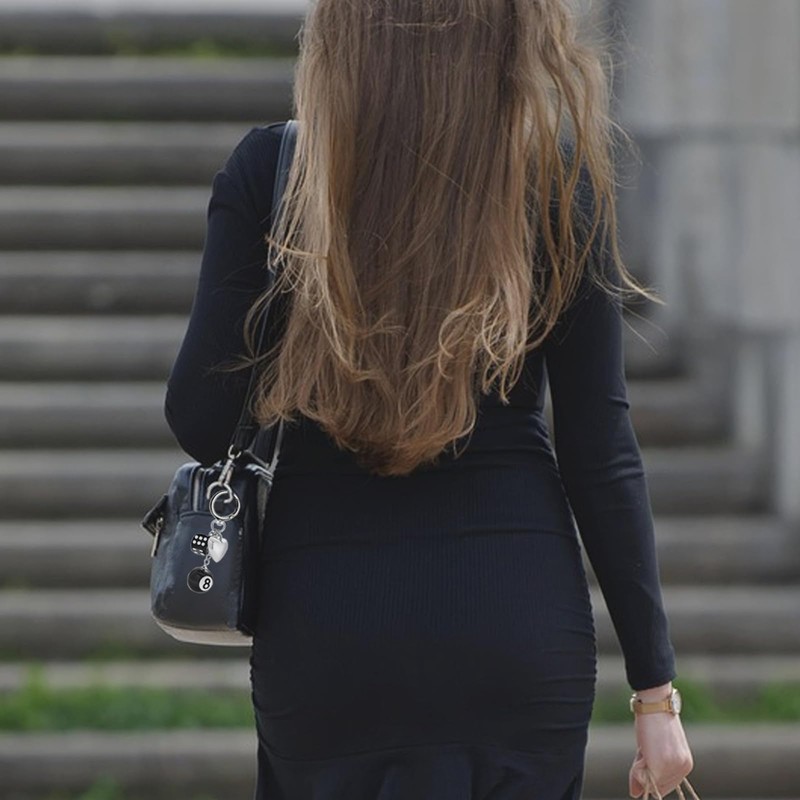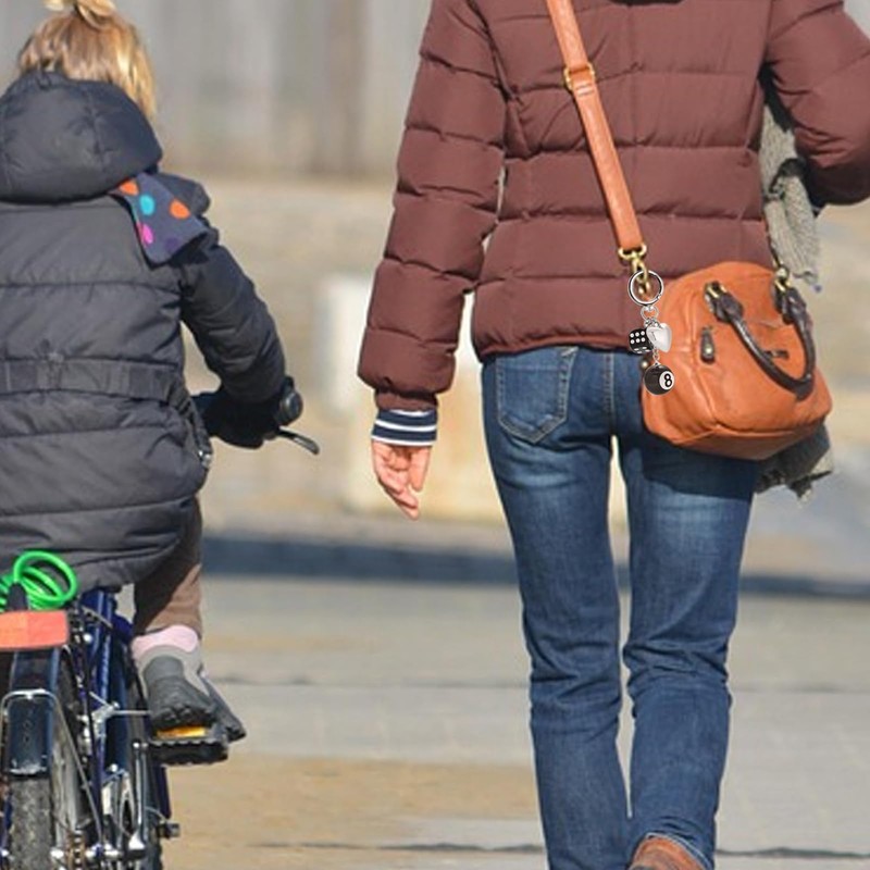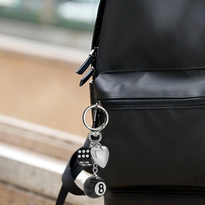 - 1. Classic & Stylish Design: This 8 ball keychain features a sleek black 8-ball paired with a matching dice keychain, creating a bold and trendy look. Perfect as bag charms or purse charms to elevate your everyday accessories.