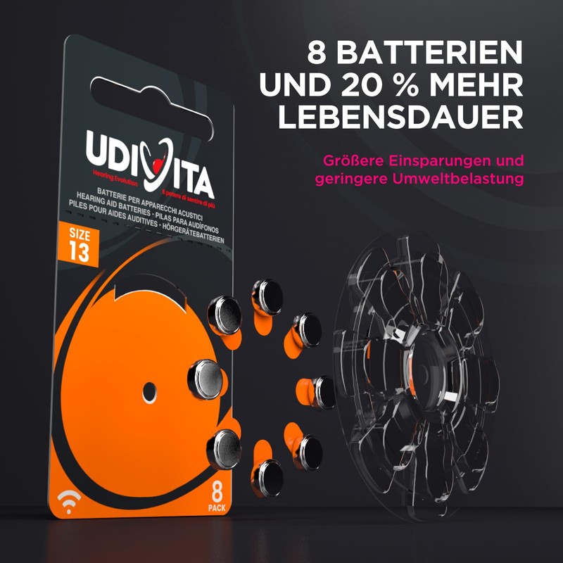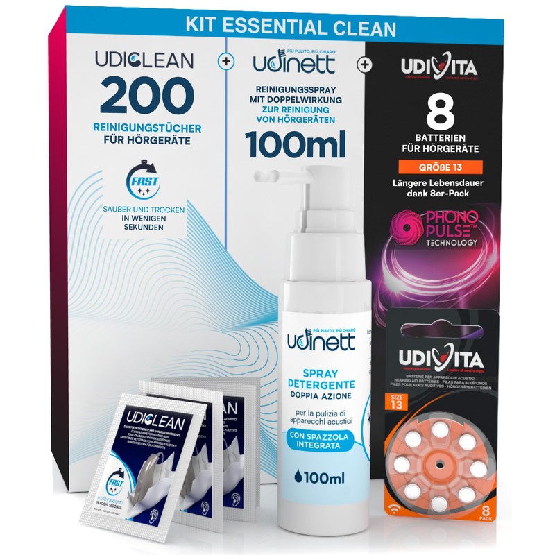 - 📦 Essential Clean Kit mit 8 Udivita PR48 Hörgerätebatterien der Größe 13 + 200 Udiclean Reinigungstüchern + Udinett Reinigungsspray mit 100 ml integrierter Bürste zum Reinigen von Hörgeräten