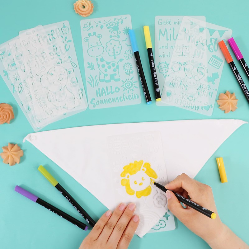 - LIEFERUMFANG: 29-teiliges Set: 8 weiße Dreieckstücher ( ca. 42x20cm ), 15 Malschablonen ( ca. 18x10cm ), und 13 farbige Textilstifte. Perfekt für Babyparty, Babyshower