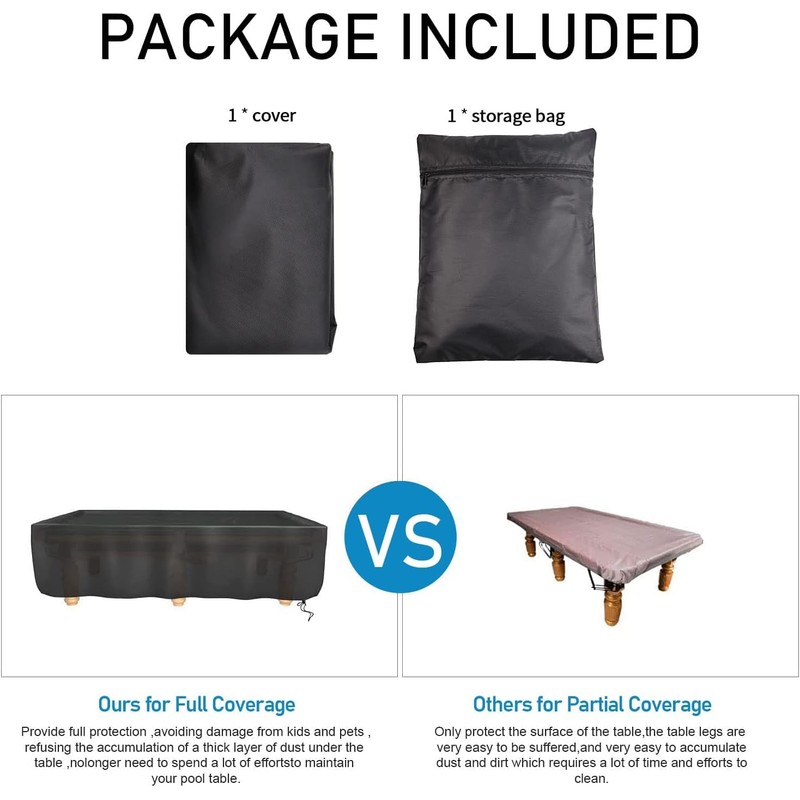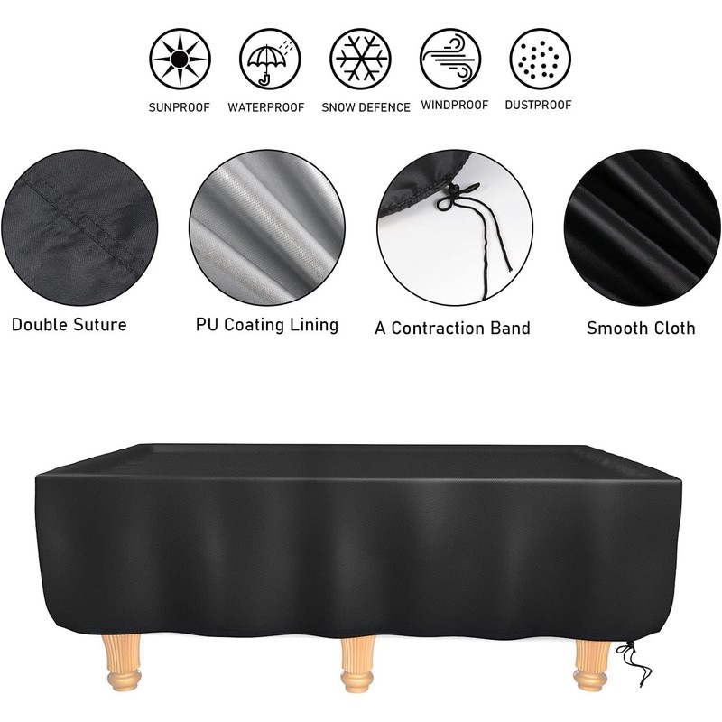 - 【Durable Material】 Made of high-density 210D Oxford Cloth with silver-plated undercoating. provide excellent water/wind/snow/rip and UV resistance, keep your pool table clean.This cover has Long service life.