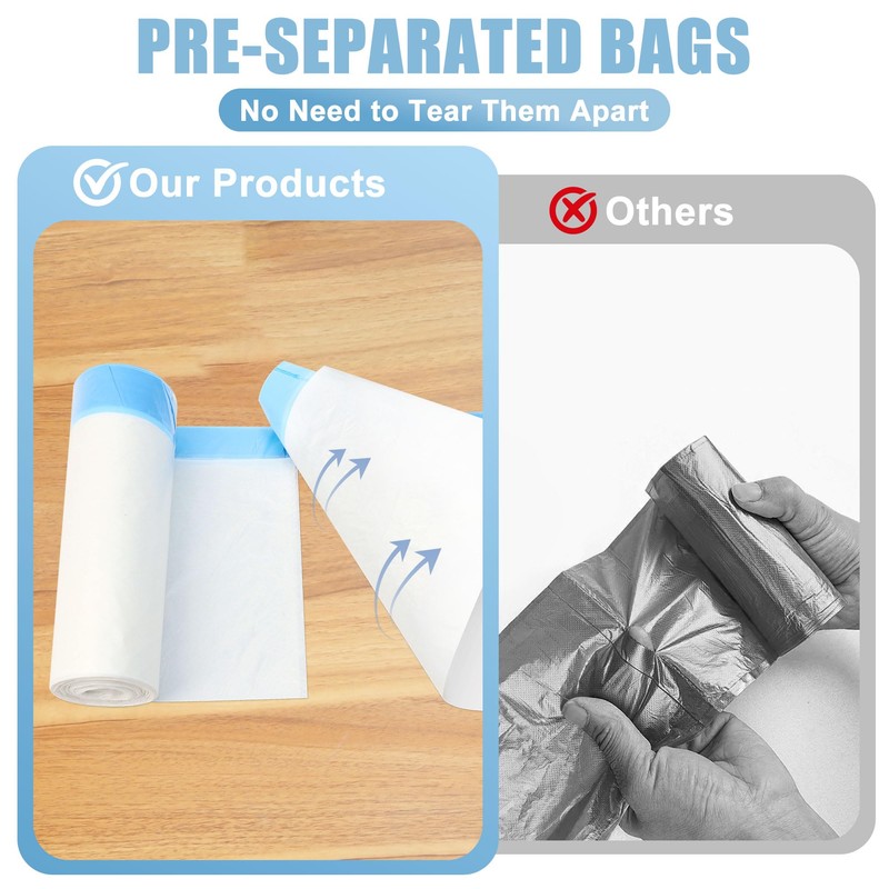 - [Pre-separated Bags]The 8 gallon trash bag is individually separated and interleaved in the roll. Just grab each trash bag effortlessly without the trouble of tearing along the hard-to-find perforation.