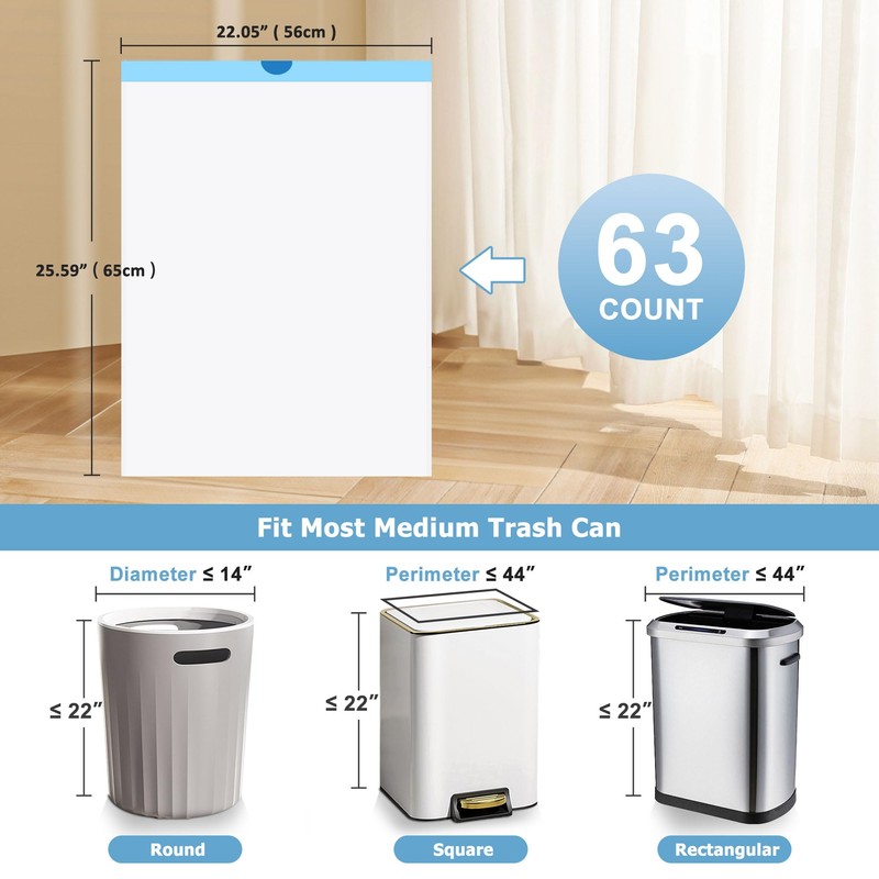 - [8 Gallon Trash Bags ]With 22.05” W x 25.59” H dimensions, these medium trash bags fit up to 8 gallon capacity for your daily needs. Perfect fit for most medium trash baskets. They come in 3 rolls, 63 count in total.