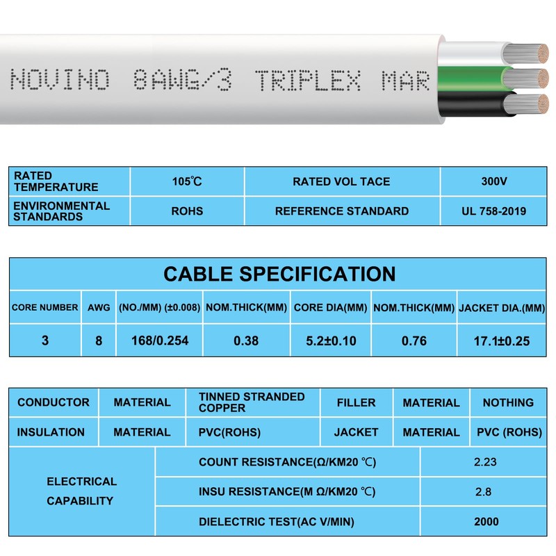 - 8/3 marine wire Spec:White PVC jacket,3 color(white,green and black) conductor sheaths, tinned & stranded true 8 AWG 8/3 flat tinned copper wire,8 awg boat wire operating voltage rate up to 600v, 105 degrees C dry, and 75 degrees C wet