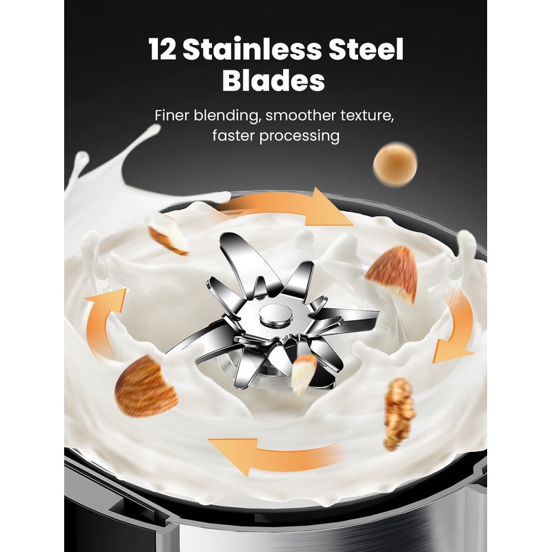 - Accesorios completos: tu compra incluye una taza medidora, un cepillo de limpieza, un colador de malla fina, una bolsa de leche de nueces, un cable de alimentación y una tarjeta de garantía, todo lo que necesitas para una experiencia perfecta