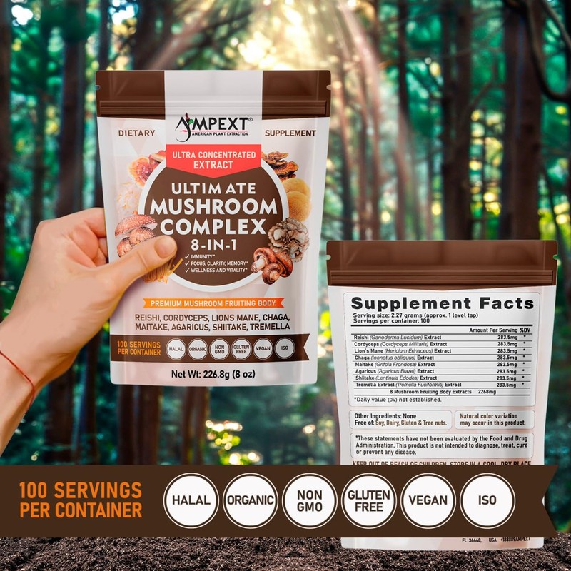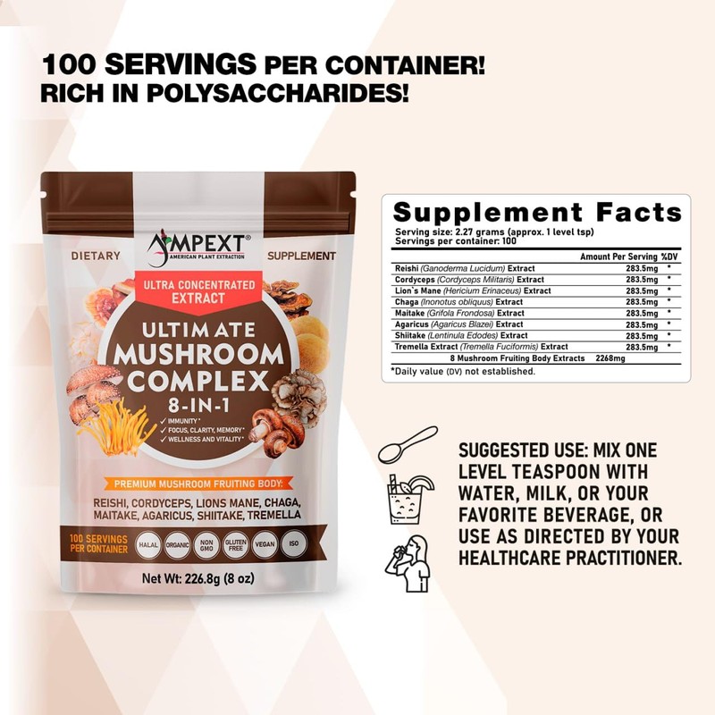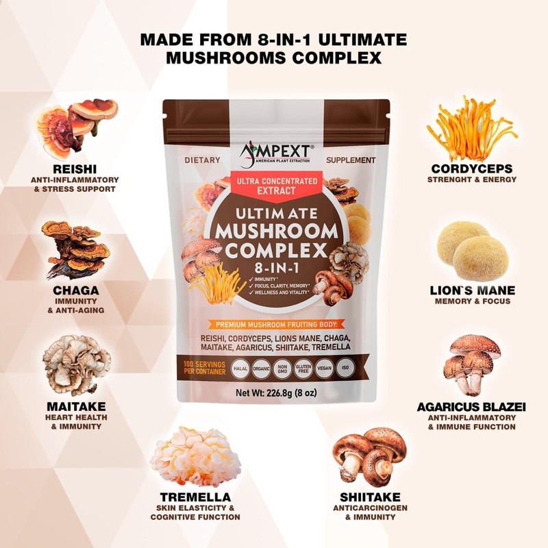 8-in-1 Ultimate Mushroom Complex: A Blend of Water-Soluble Extracts from 8 Powerful Mushrooms, Formulated to Support Immunity, Enhance Clarity, Memory, Focus, Promote Wellness and Vitality