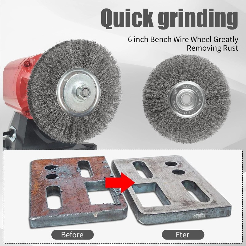 Superb Durability: This wire bench wheel Brush is made of high quality materials, making it extremely durable. The inner and outer fixing plates are made of thickened steel, which maintains its strength and stability even under high rotational speeds and heavy pressure,capable of long term use without significant wear and tear.