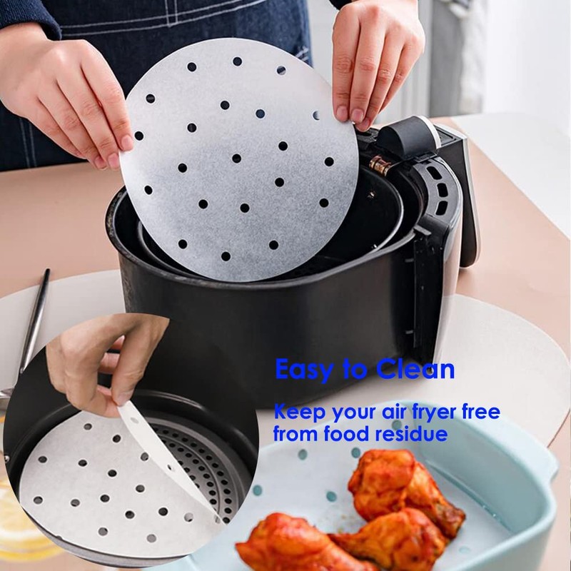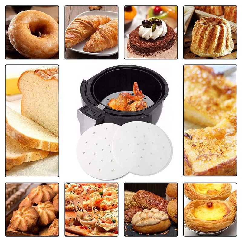 - Non-stick and Easy to Use - The air fryer liners keeps your air fryer basket or steamer free of food residues and make them clean easily. Food can be easily slide off from the baking tray and you just need to remove the paper and throw it away after baking. Our pre-cut perforated parchment liners are ready to use straight from the pack in round 8 inches