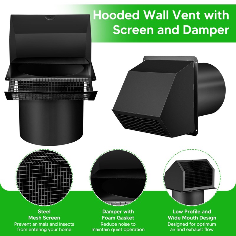 - Wide Application --- The wall exhaust vent is designed for optimal exhaust flow and protection. Not only can it be connected to the duct and used together with the bathroom exhaust fan or range hood to form an exhaust system. It can also be installed vertically on the wall as a vent for basements, garages, etc.