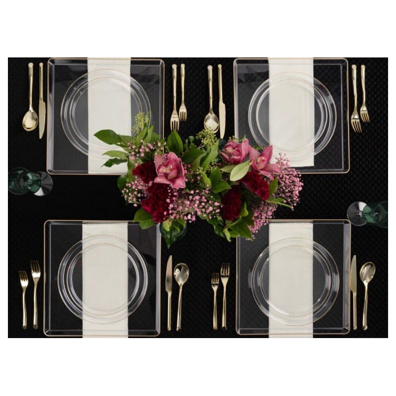 - Elegant Gold Rim for Added Sophistication: The clear round plastic plates are accented with a chic gold rim, instantly elevating any table setting. Whether you're hosting a formal dinner party or a casual brunch, these plates bring an elegant touch that complements both simple and lavish decor.