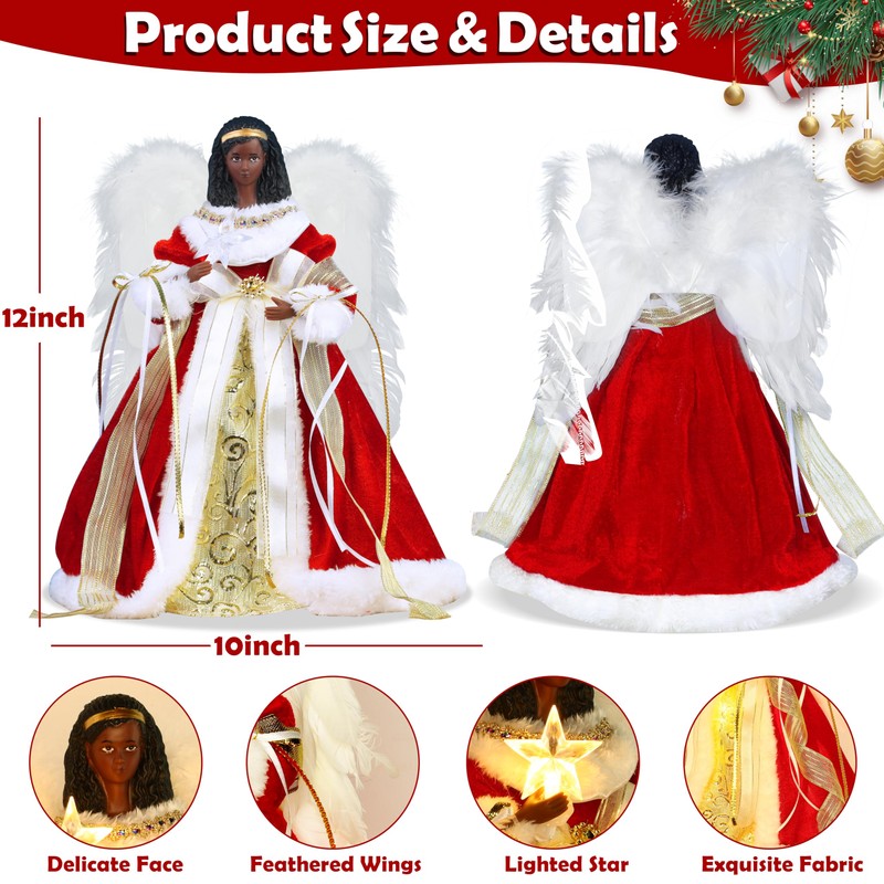 • 12 Inch Black Angel Tree Topper: The black angel Christmas tree topper measures 12*11 inch(H*W), designed as an angel holding a star, wearing luxury dress and a pair of white feather wings; With 10 light, angel tree topper can light up your holiday