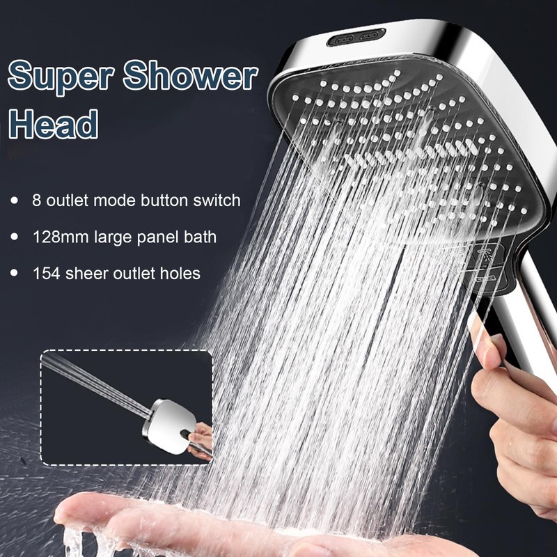 8 Modi Hochdruck Duschbrause, 12 cm Duschfläche, mit Filter und Absperrband, Wassersparend und Kalkfrei (Ohne Schlauch, Silber)