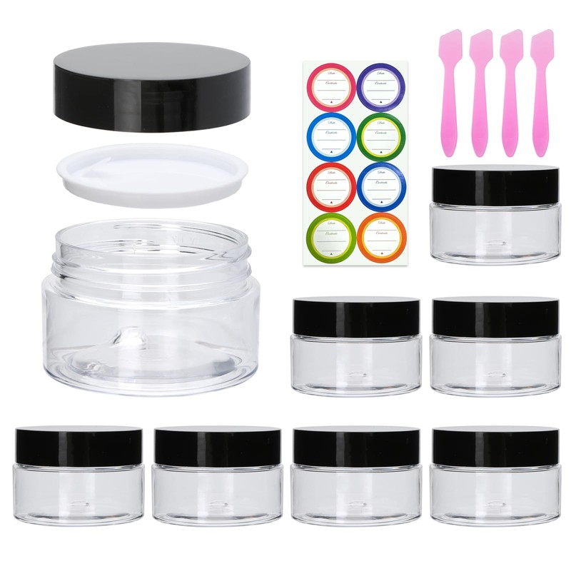 • SUPER VALUE PACK: You will get 8 clear 1oz plastic containers with black lids,labels for distinction and spatulas for dispensing or mixing, used for anything you want to store. Personalized stickers/labels are ideal for business and promotional goods