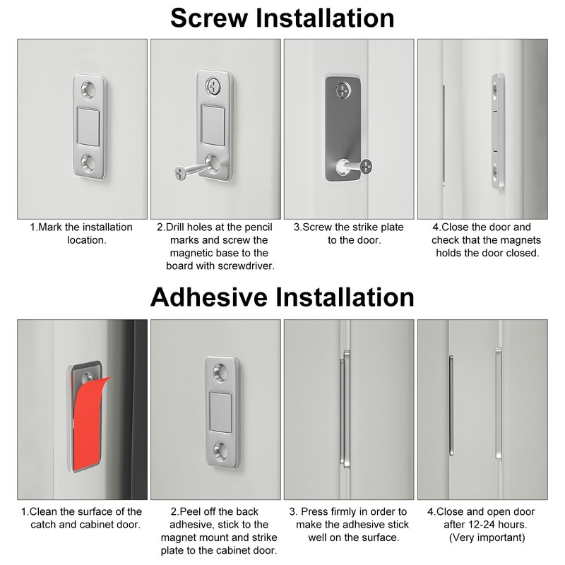 - What you get and Warm tips: 4 x cabinet magnets; 16 x screws; 8 x double-sided adhesive. Please close and open the door after 12 hours so that the adhesive sticks well to this surface.