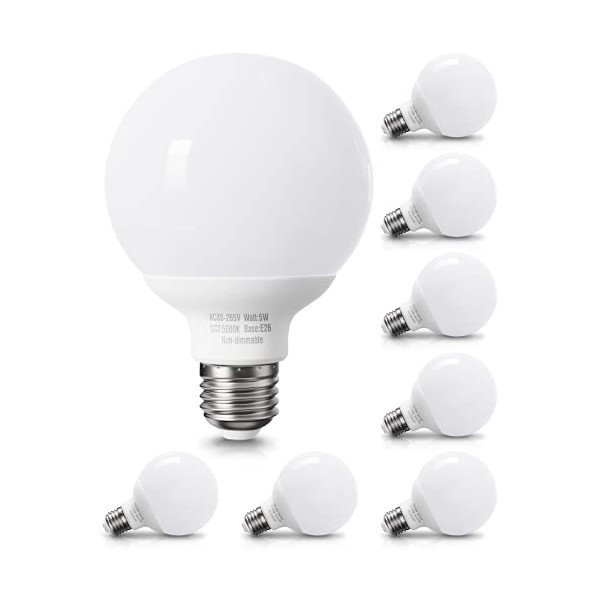 8 Pack Daylight LED Globe Light Bulbs for Bathroom, 120V 60 Watt Eqv., E26 Base, Non-Dimmable Vanity Light Bulbs Round, 5000K Bright G25 LED Bulb Over Mirror
