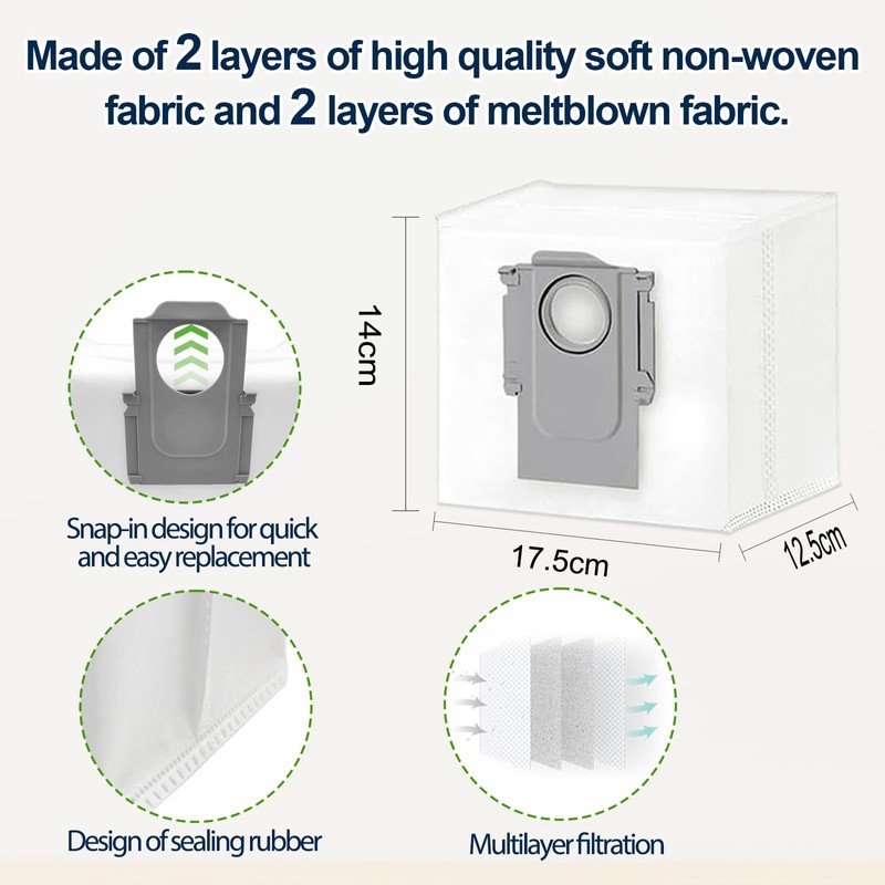 - ✅ Perfect compatibility: Our dust bags are only suitable for Roborock S8+/ S8 Pro Ultra/ S7/ S7 MaxV Ultra/ S7 Pro Ultra/ Q7+/ Q7 Max+/ Q8 Max+/ Q5 Pro+ and other vacuum cleaner models. Please check compatibility with your vacuum cleaner model before purchasing.