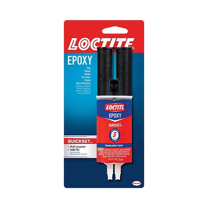 This quick-set epoxy features a special double-barrel syringe nozzle to dispense equal amounts of resin and hardener every time to ensure the perfect bond in all projects. Resistant to solvents, impact and moisture. High-strength, 5-minute set epoxy bonds wood, metal, ceramics, glass, most plastics and tile.Loctite Quick Set Epoxy Quick Set, 0.85 oz Carded Syringe, Translucent, Liquid