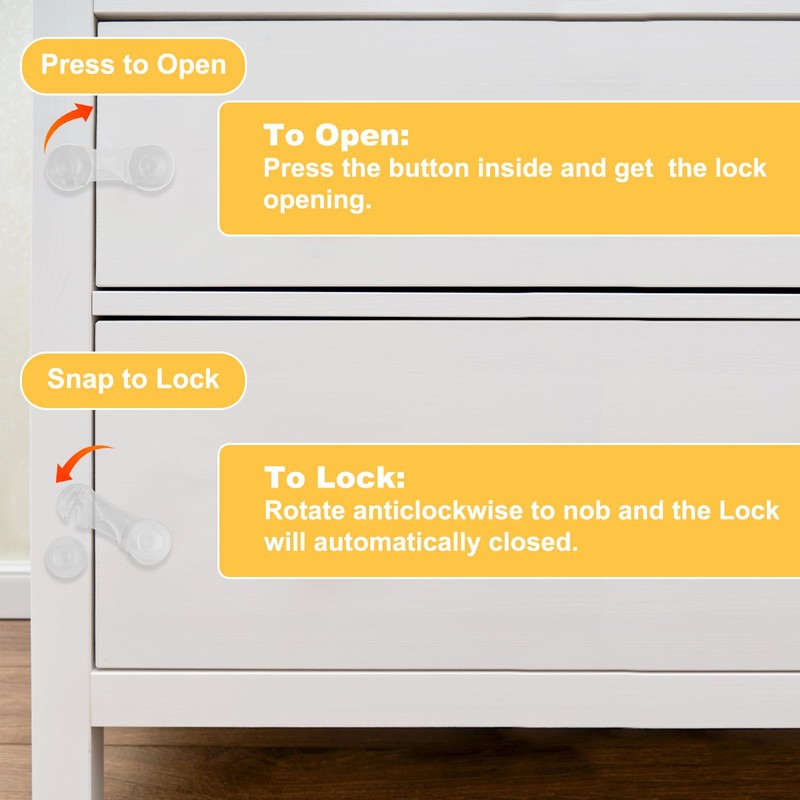 - One-Handed Operation: The Drawer latches for child safety features a keyless design, The home safety tools are easy to open and close for adult, you can just use one hand to press the button and lift the latch to open it. And for children, it is not easy to open it.