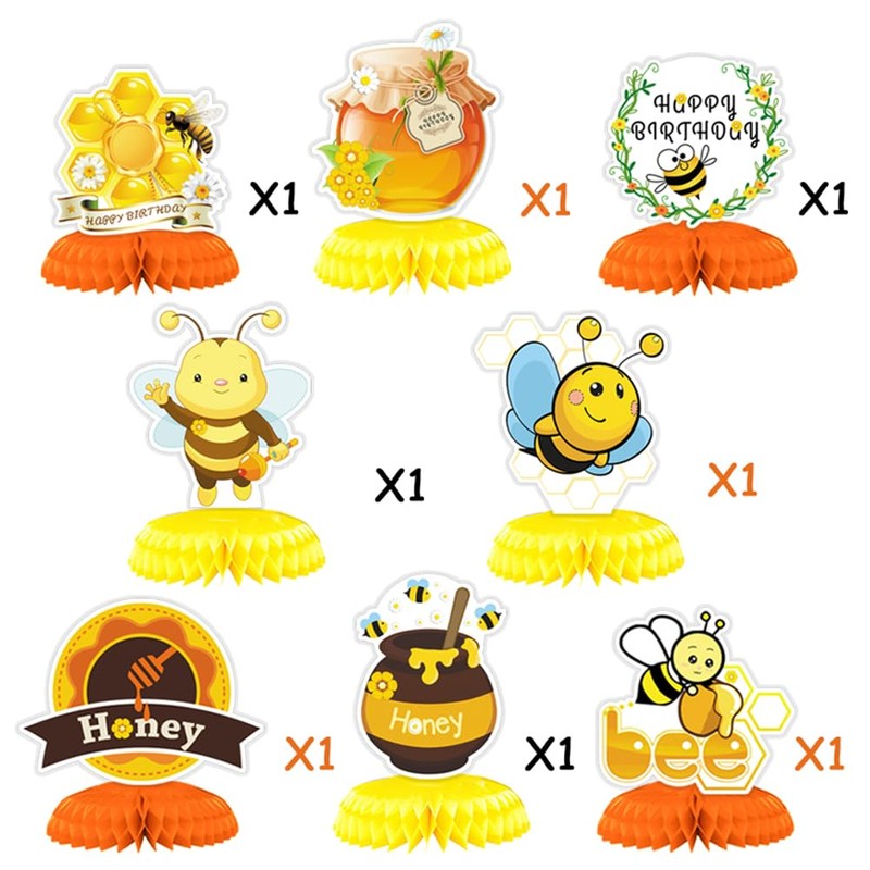 • 【Bee Themed Birthday Party Decorations】This table decoration using lovely bee themed elements,includes honey pot,bumble bee in different pose,Happy Birthday word,flower and honeycomb.Great for bee-themed table decor to building a lovely atmosphere.
