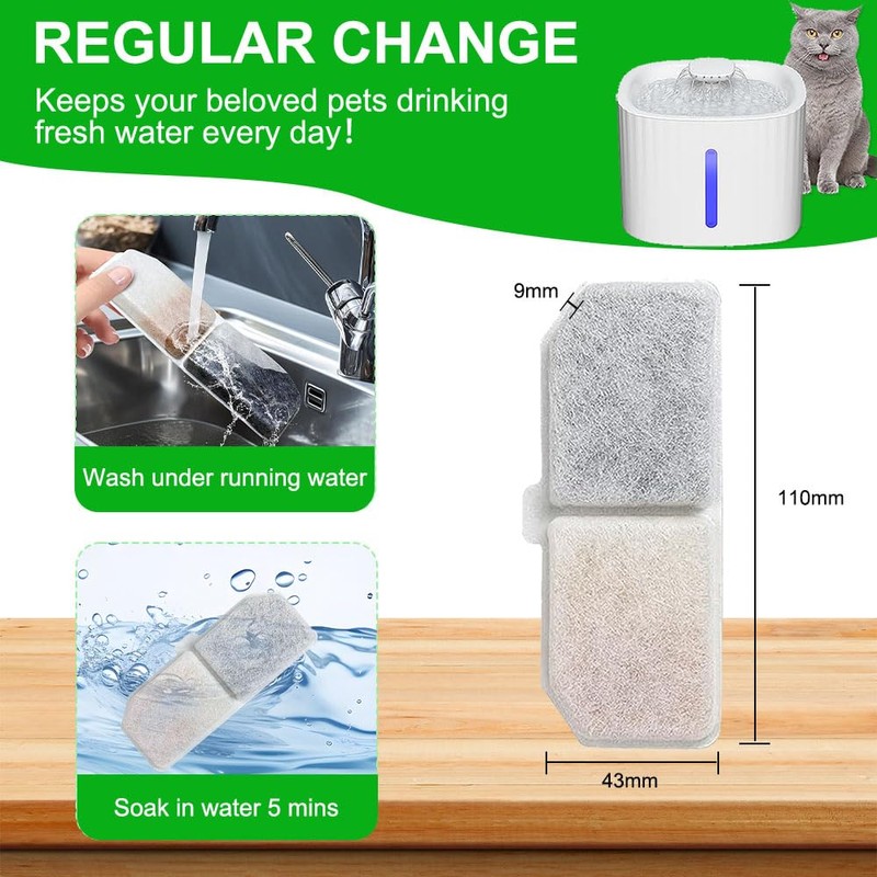 - 【EASY TO REPLACE】In order to keep the drinking water fresh and hygienic, it is recommended to replace the filter every 1-2 weeks in summer (2-4 weeks in winter) depending on the number of cats in your home. Before using the pet fountain filter replacement, please rinse it thoroughly under running water for 3-5 minutes, and then install it into the cat drinking water.