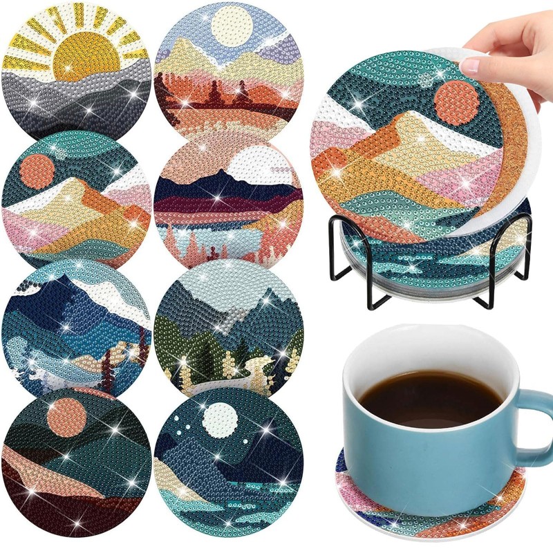 - Landscape Theme Design: This diamond painting coasters is designed with classic landscape elements, including mountains, sun, creek, etc, full of fun and appeal, bringing a little different color to your desktop