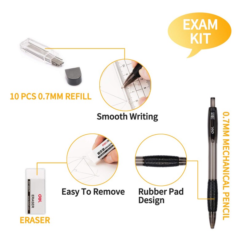 - ☛ EXAM KIT: 1 mechanical pencil, 1 box of 0.7mm replacement lead refill, 1 eraser. The pencil features smooth writing and durability. Block style of the eraser is perfect for getting into little corners or erasing large areas quickly. This pencil case set is a must-have for students.