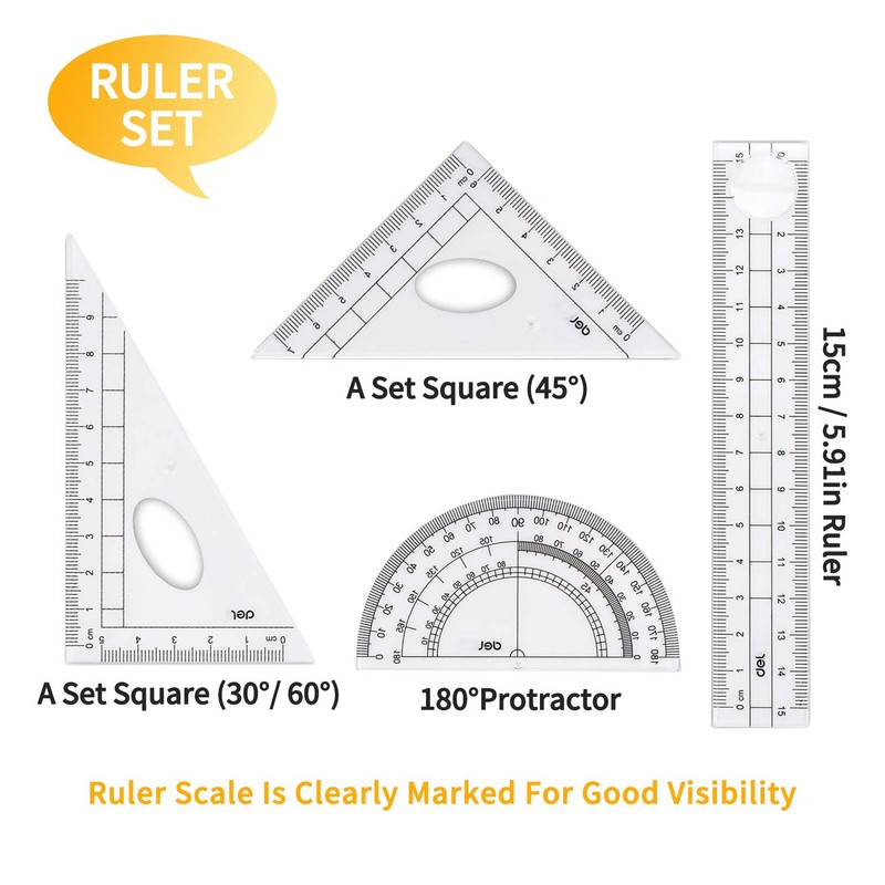 - ☛ RULERS FOR SCHOOL: The ruler set is made of ransparent plastic for easy measurement. The 15cm ruler, 45° & 60° set squares & 180° protractor feature a name plate for easy identification along with CM & Metric graduations.