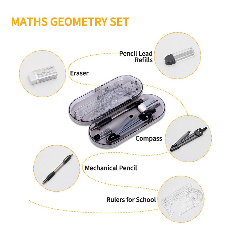 - ☛ MATHS KIT INCLUDEDS 8 PIECES: 1 School Compass, 1 Eraser, 1 set of Pencil Lead Refills, 1 Mechanical Pencil (0.7 mm), 1 Protractor, 1 Ruler(6"), 1 Set Square (30°/60°), 1 Set Square (45°). Essential math study tool kit for students, perfect school gift.