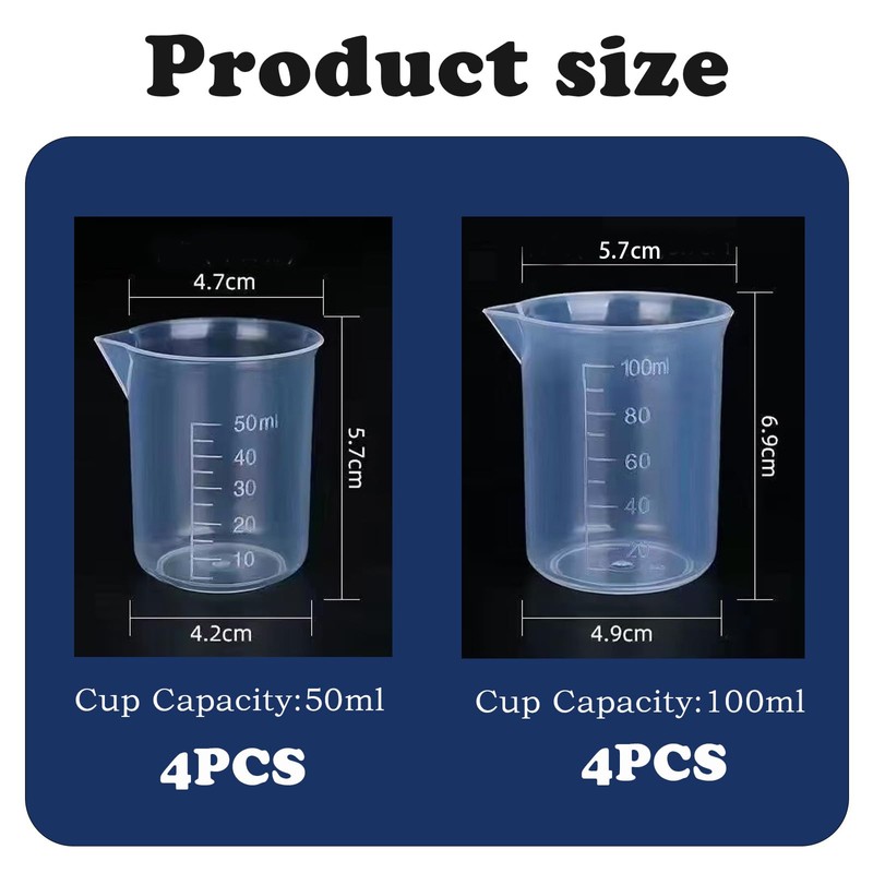 - Versatile Set: Includes 4 pieces of 100ml and 4 pieces of 50ml measuring cups, providing a range of options for different tasks; Ideal for measuring liquids in recipes, DIY projects, and small-scale experiments
